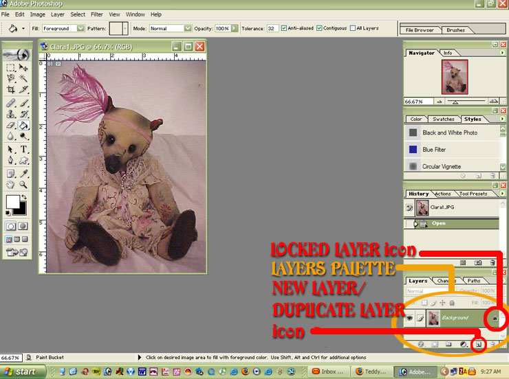 2.)  Add a NEW LAYER by going to the LAYERS PALETTE and clicking the NEW LAYER icon.  This will add a transparent layer to your document.  Make sure to place the transparent layer UNDER the image layer.