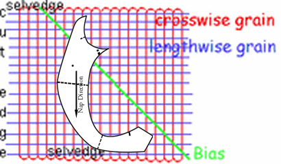 One question for Shelly... If I am understanding you correctly... the GRAIN of the fabric is UP and DOWN. The BIAS is diagonal. The NAP of the mohair runs DOWN. When you have an ODD shaped pattern that you want the nap to travel down, how should you place it on the fabric? Is this pic below correct? IF it is not correct I imagine I could cut differently and retrain the nap of the mohair.