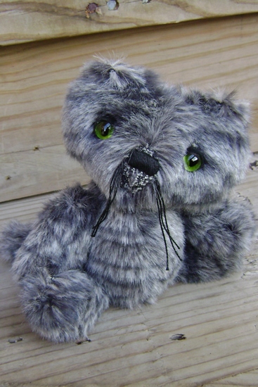 Carey is an 8.5" fat cat made from a gray and white striped plush. He has green glass cat eyes with black ultrasuede eyelids and a black hand embroidered nose of perle cotton. He is stuffed with the finest polyester fibers and steel shot. He is fully (5-way) jointed for poseability. Carey is available now. Contact me for details.