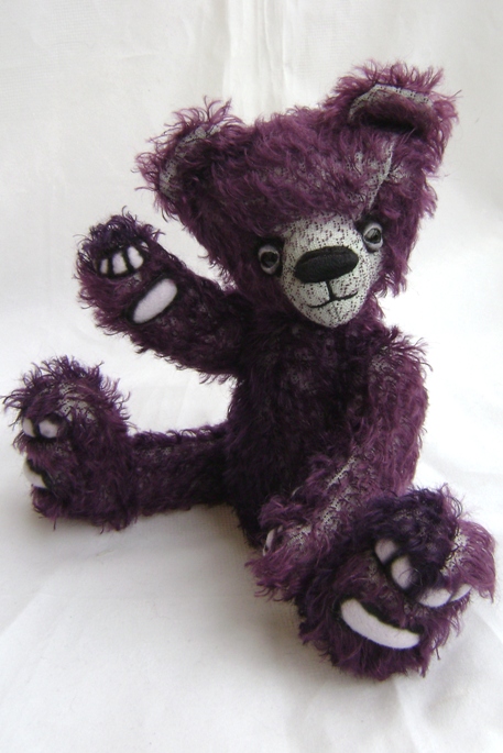 Today, I would like to present Erinn. Erinn is a 10" teddy bear made out of a hand-dyed deep purple mohair with a gray/lavender back. Erinn is fully (5-way) jointed with cotter pins and she is stuffed with polyester fiber and steel shot. She has reverse trapunto paws and feet made out of lavender wool felt. Erinn has airbrushed details around her eyes and on her paws and foot pads.