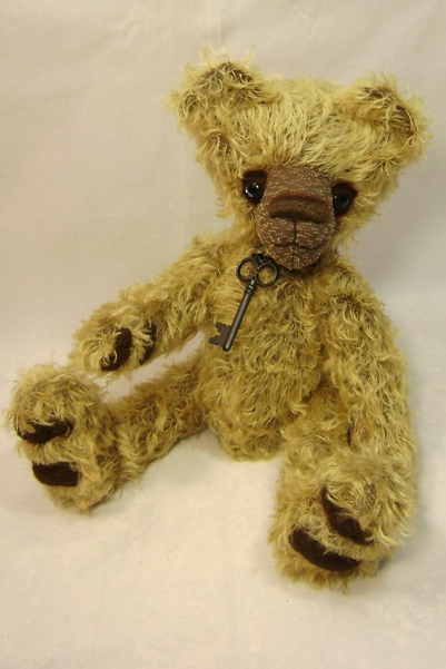 I have been working on perfecting my newest style with eyelids and reverse trapunto paws. Today, I have Henry to present to you! Henry is a 12" bear made out of a golden tan mohair with a brown back. He has hand-painted blue sparkly glass eyes with wool felt eyelids and a hand-stitched brown nose. Henry's paws and foot pads have been done in a reverse trapunto style. Henry has airbrushing around his paws/feet, around his eyes and his nose. Henry comes with a key necklace with wire that is twirled like a spring.