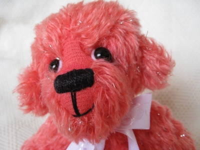 He's made from a salmon pink mohair with gold sparkles. He also had glass eyes and a black handsewn nose.