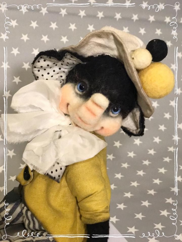 kid sewn from mohair and alpaca . filled wool and granulate. can stand if he wants)cap and trousers in Italian velvet. flowers made of felt, decorated with beads.