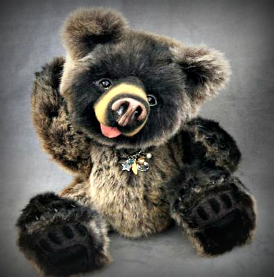 Tigon is a 15" OOAK realistic black bear. He has black and white glass eyes. Made from mohair and Tissavel fur. Leather eyelids. Hand sculpted resin nose and mouth. Needle felted muzzle and eyebrows.
