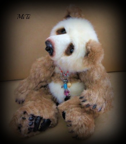 Novad is a 13 1/2" OOAK grizzly bear made out of tye-dye mohair and Tissavel fur. 5-way joints. Poly fiberfill batting. The arms and legs are attached with metal bolts, washers and nuts. Glass eyes. The eyelids are hand painted leather. The fur around the eyes is hand painted mohair. The upper neck area is mohair. Lockline neck. The teeth, nose and tongue are made from epoxy clay. The hand painted trapunto paw pads are leather. Hand painted resin claws. All of the coloring on Novad is also hand painted.
