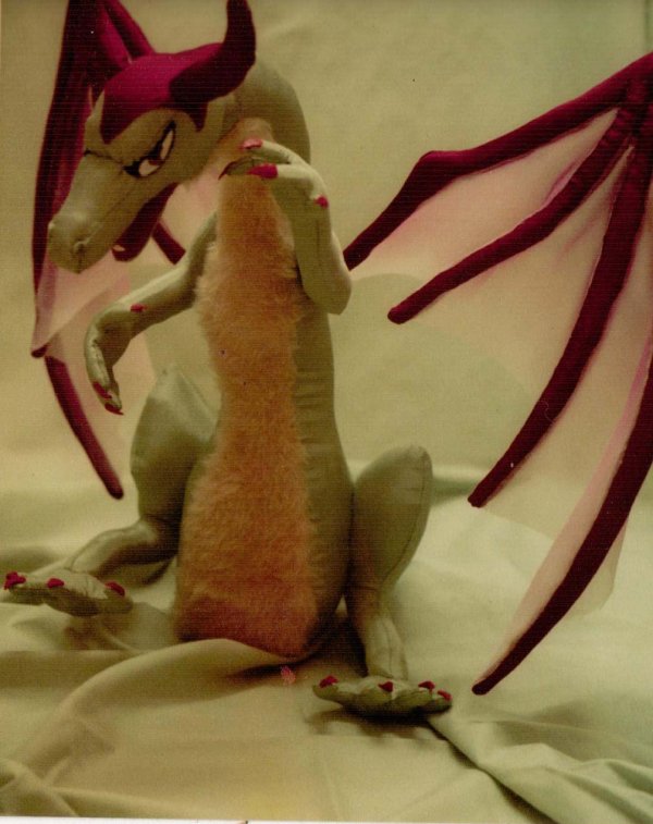 This is Music. He was actually a painted sweat shirt first, but this isn't a sweatshirt forum! He was made from fairly cheap lining fabric and the kind of crappy fur fabric that was around at the time. I think he was made in the early 80's.