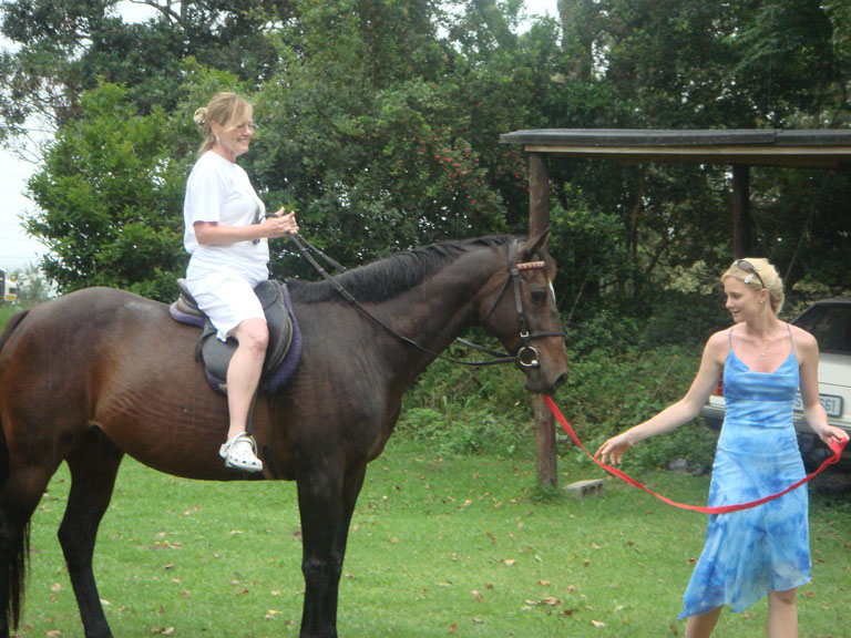 Kim- the 2nd day, I must say,when I got off, I thought I was going to walk around in a rather strange way, but I was fine. I can see what good excercise it is for your butt, legs and tummy thou. Sandy, in Cape Town, rides a horse, whose owner has had a baby so she shares in with the costs and gets to ride the horse every day. Charlie lives far to far from her, about 1000 miles, maybe in the near future Dale and her can get a small place in Cape Town and she could bring Charlie with her. Charlie has been her horse for the past 17 years, and she says as a little girl she would curl up with him and sleep with him.