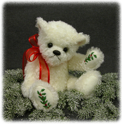 Raymond is made of Intercal's 3/W white kid mohair. It's a 3/4" medium density pile with a whirl finish. He has embroidered holly & berries on opposite paw & foot pads. The berries are accented with red glass beads. His face is lightly shaded with prisma colored pencils, his eyes are blown glass & he wears a sheer satin bow. He has sewn in tush tag & little pewter "made with love" heart on his rump. He's very special to me so I named him after my step-son. After all my hard work I had to hold on to him for a while. He'll be available for adoption on Ebay Dec. 1st., until then be sure to look for him in the magazine. bear_laugh ~ yaaa