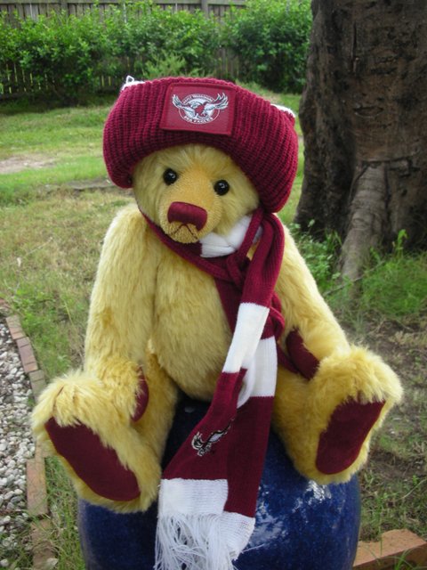 manlynoclothes.JPGbroncos.JPGmanly.JPGHere are a few bears I was asked to make by my Uncle and  friend. They both wanted a rugby league bear in their teams colours. So along came Broncos Bear ( Maroon/yellow) and Manly bear(Maroon/white) each sporting a beanie and scarf from their favourite team. Both are made in the same yellowish fur with pawpads matching the team colour. I used a pattern by Lisa Dopking of Megelles bears - 38 cm. Poor Broncos bear had to have his clothes sewn on ( by request) - he does have ears under that beanie I swear.