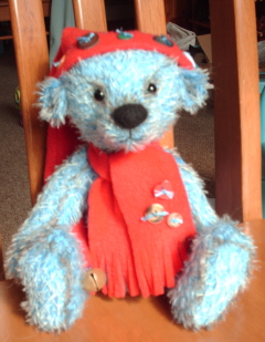 Hi Everyone this is sam, the wrong time of year for this sort of outfit but it seems to suit him so maybe he's off somewhere cold! He is 12" tall and made of a gorgeous blue mohair and Cotton string? mix. I hope you all like him all comments would be much appreciated, started to get really nervous about my first show!