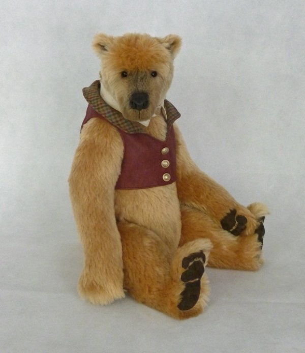 meet Arthur - 26", 6-way jointed, Shulte super-dense mohair with trapunto leather pawpads and a sculpted leather nose. Rod-jointed shoulders and hips, wired ears and a reversible leather vest and antique linen collar