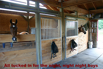 The boys all tucked in for the night snack hay nets hung just so everything is okie doki, night night my angels.