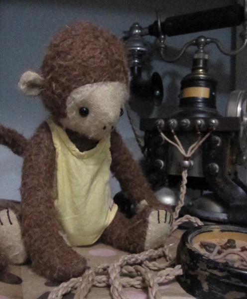 I made this for my daughter for her 1st birthday! 12" monkey in vintage doll playsuit, in banana yellow of course! She has 8 mm antique boot button eyes. And yes, I let my daughter play with the monkey. I never leave her alone to play with her toys, I'm always there, it's securely sewn, and she doesn't even pull at they eyes etc.