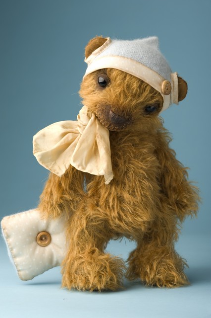 DSC_2478.jpgDSC_2469.jpgHere is my sleepy beauty :D, oh, sleepy bear Oscar bear_original  - 11" made from special bear material – mohair, ears and paws from genuine leather, has got 5 joints (double for the head), glass eyes, embroidered and waxed nose, shaded with oil paint, stuffed with fiberfill and mineral pallets. On the neck he has real silk bow , aged with coffee, and sleepy cap, made from mohair and cotton. Oscar in his hands has the pillow which he carries everywhere with himself – you never know when you can fall asleep bear_original