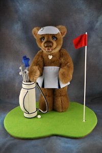 Anika is 16” tall and made of 5/8” Toffee Schulte plush. She is a commissioned bear. All of the golf accessories were really challenging and fun to make. Hope you enjoy seeing her!