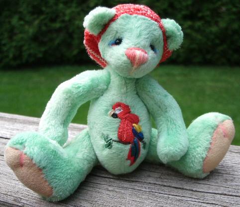 Hello!! Say hello to Mac, the newest addition to my In The Garden series bears! Mac is made from a beautiful micro fabric in a multi-green colour, and stands 4.5 inches high. He comes with a hand knit beret in a varigated red fingering yarn which is not removable, and has had his tummy embroidered with a scarlet macaw (parrot) done in silk ribbon and completely freehand. More pics and information on his Bearpile page. Thanks for peeking! :lol: