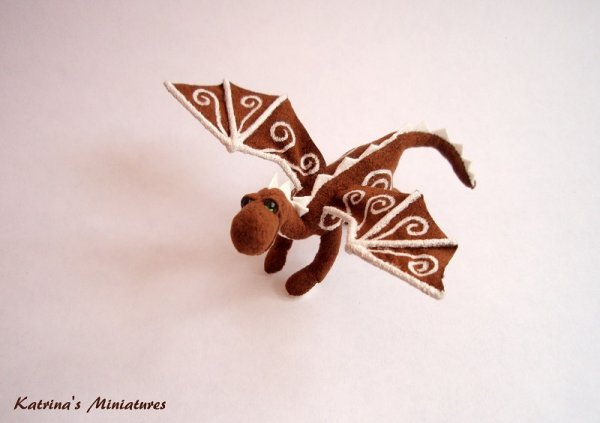 I'd like you to meet Gingerbread, my first Christmasy dragon hatchling! His "icing" is white ultrasuede on his spikes, belly, and feet. The rest of his icing has been hand-painted on. He is 4.25 inches long and has a wingspan of 3.5 inches.