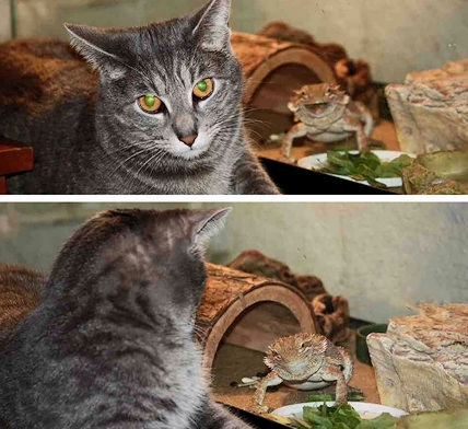 Cat doesn't appreciate dragon lizard's photo bomb.